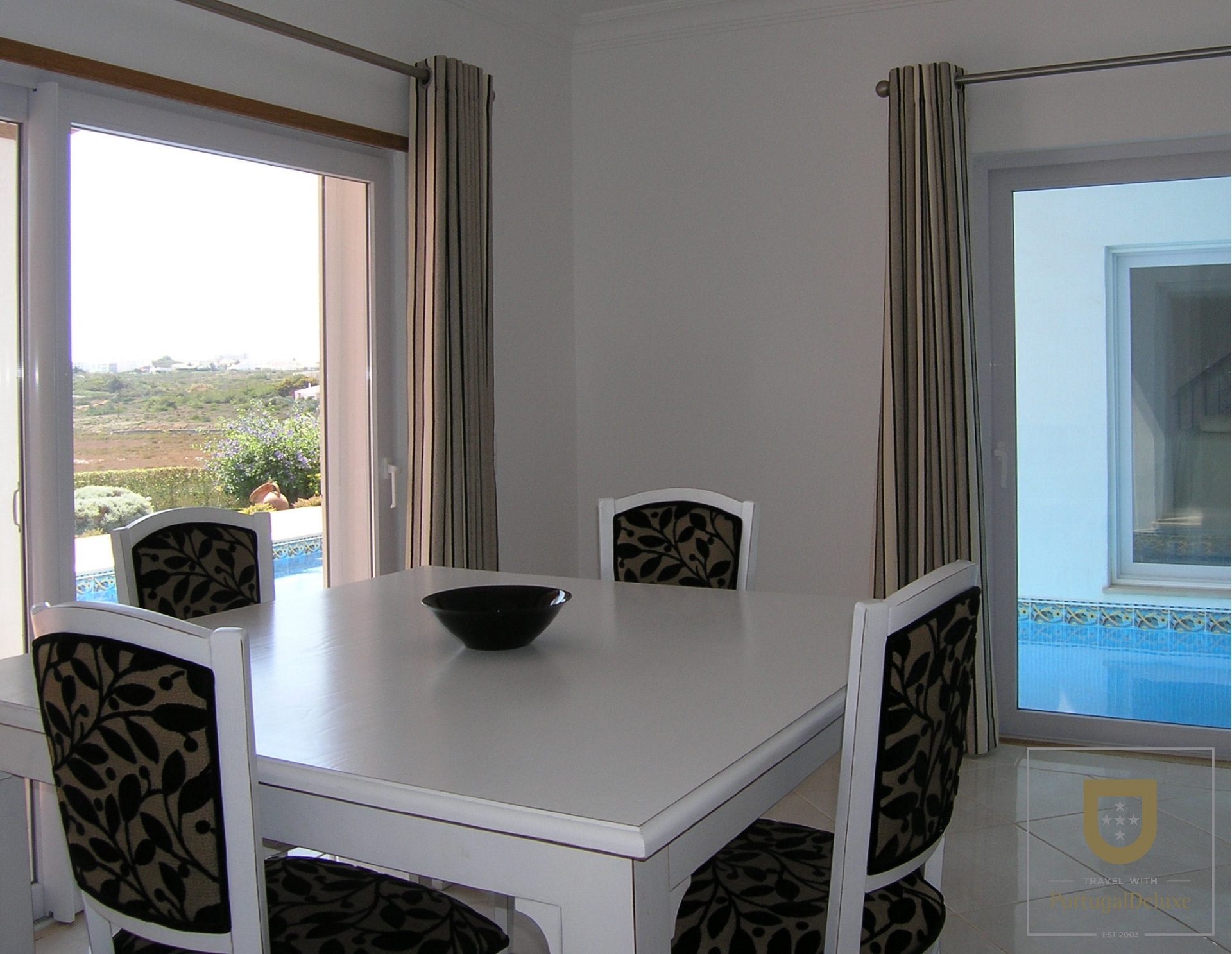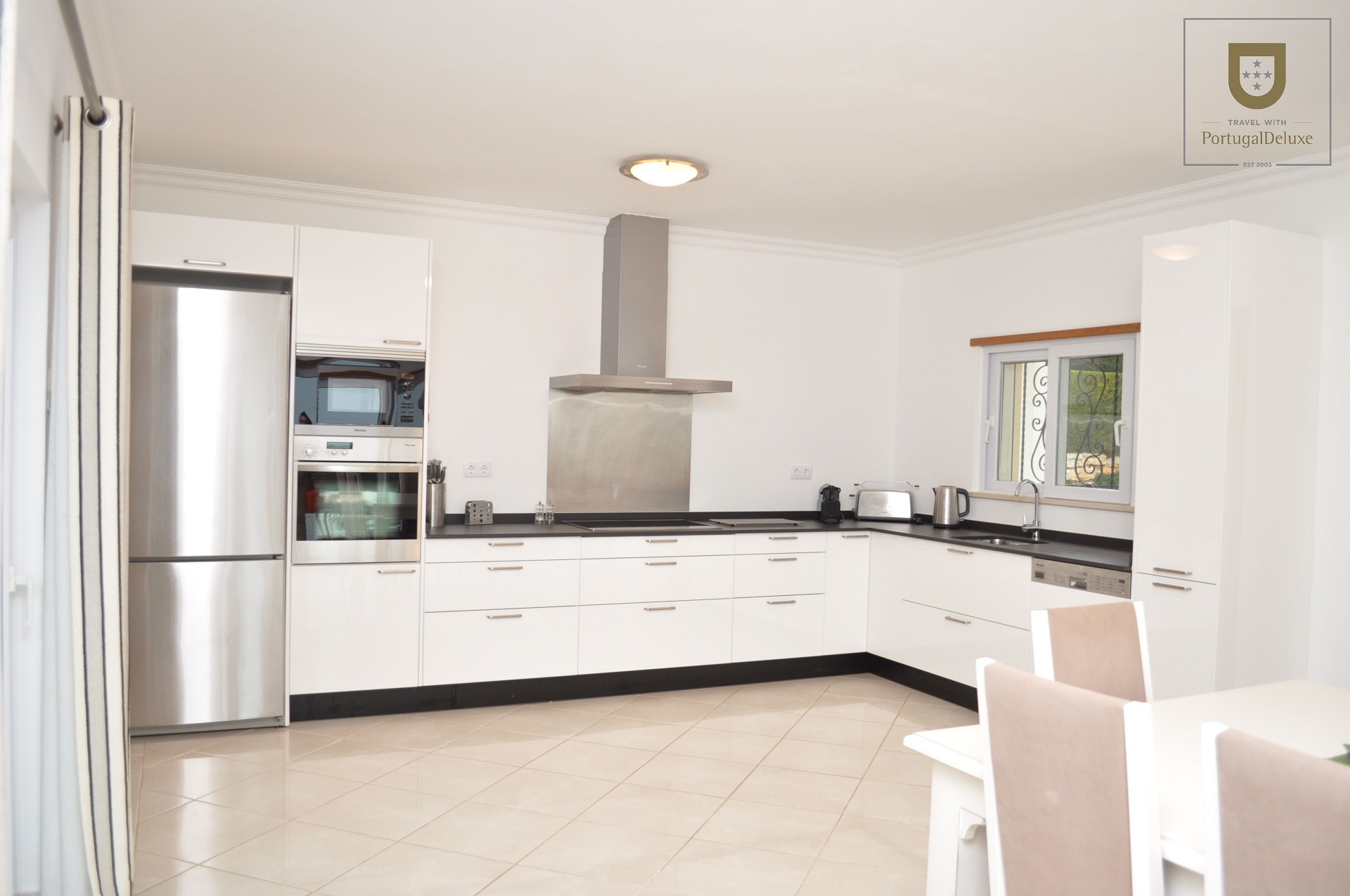 Características principais: 3 quartos (1 quarto principal; 1 suite; 1 quarto com duas camas individuais); cozinha totalmente equipada; lavandaria; sala de estar; sala de jantar; terraço no primeiro piso; jardim privado com barbecue; piscina privada.