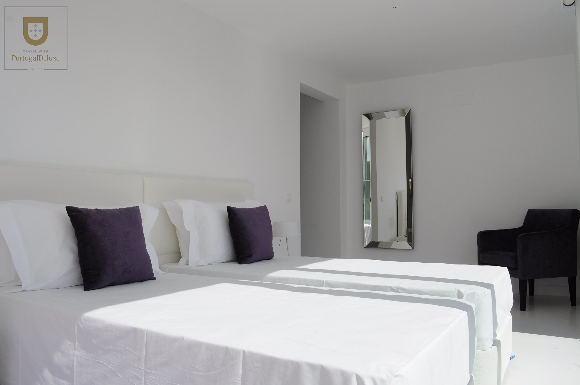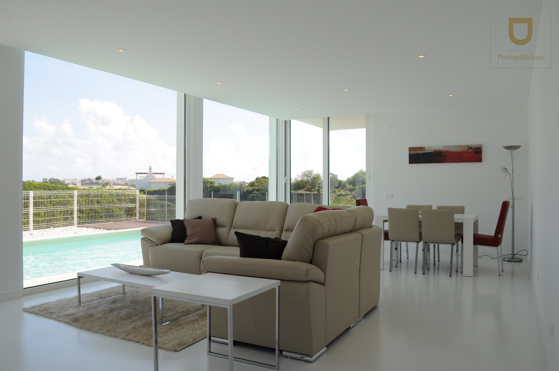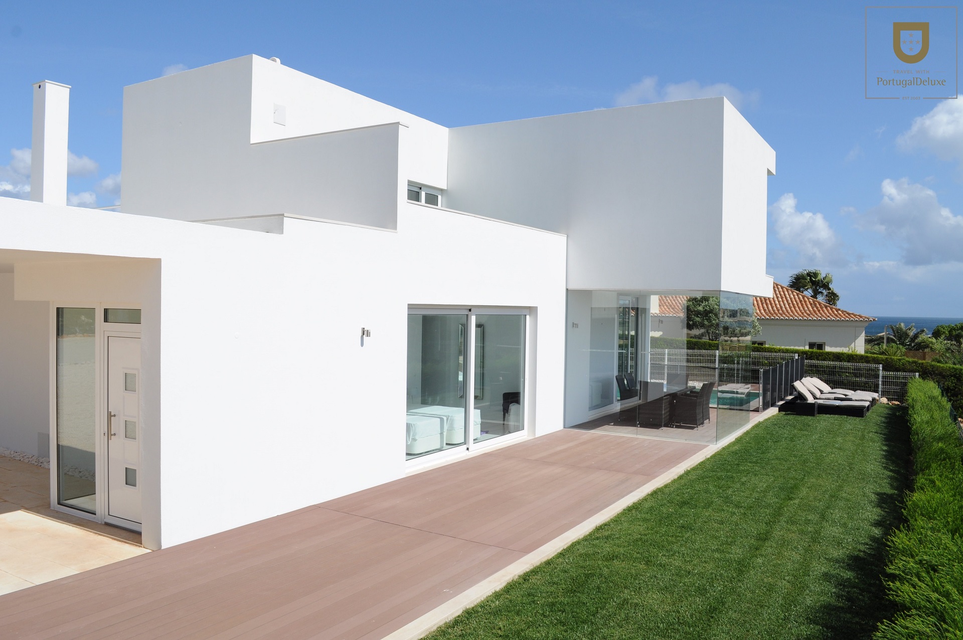 Villa de design moderno com grandes portas e janelas em vidro que permitem a entrada de muita luz natural. O azul do céu e da água da piscina são realçados pela fachada branca da casa. A localização permite privacidade, mas também uma espetacular vista mar dos quartos do piso superior.