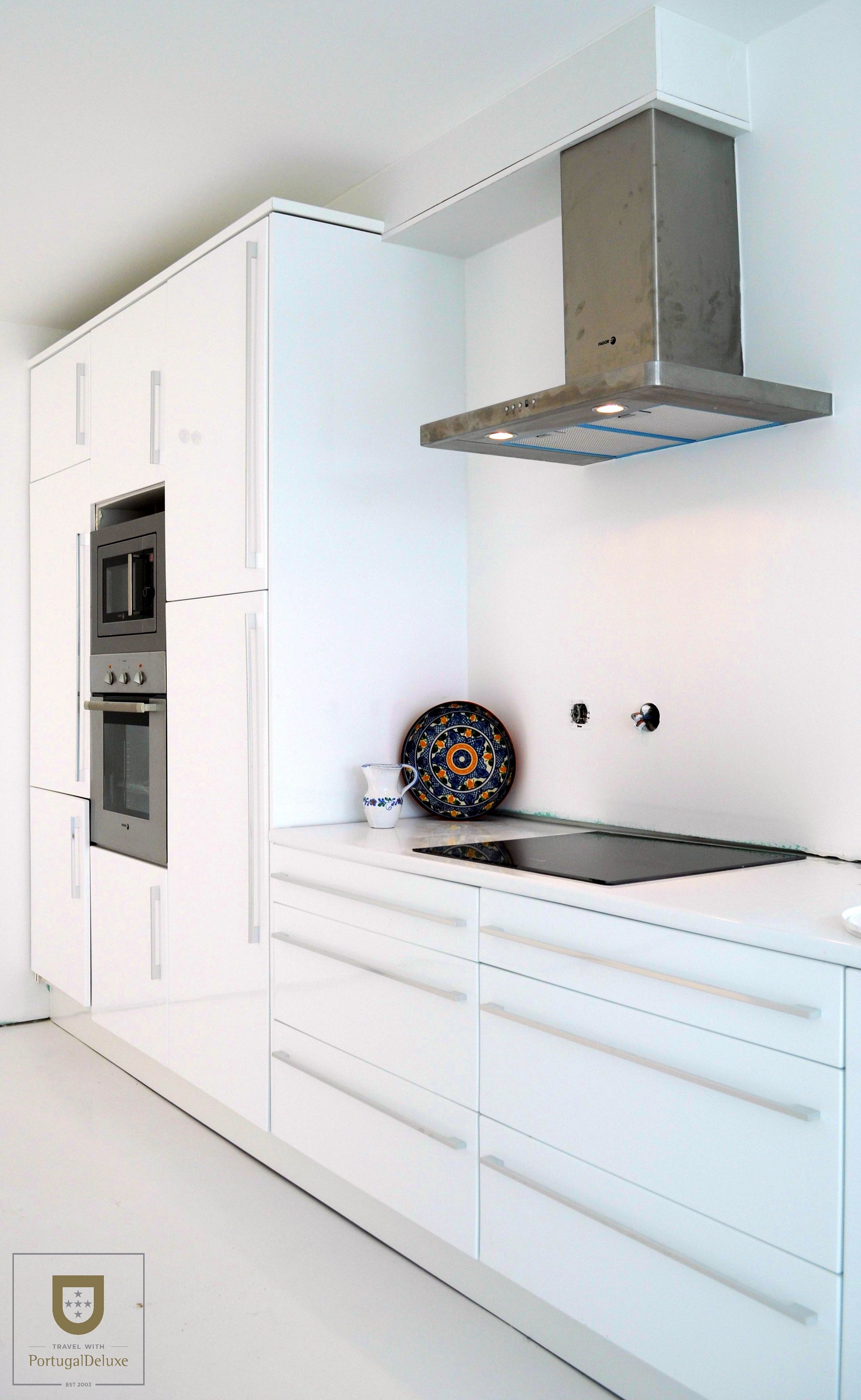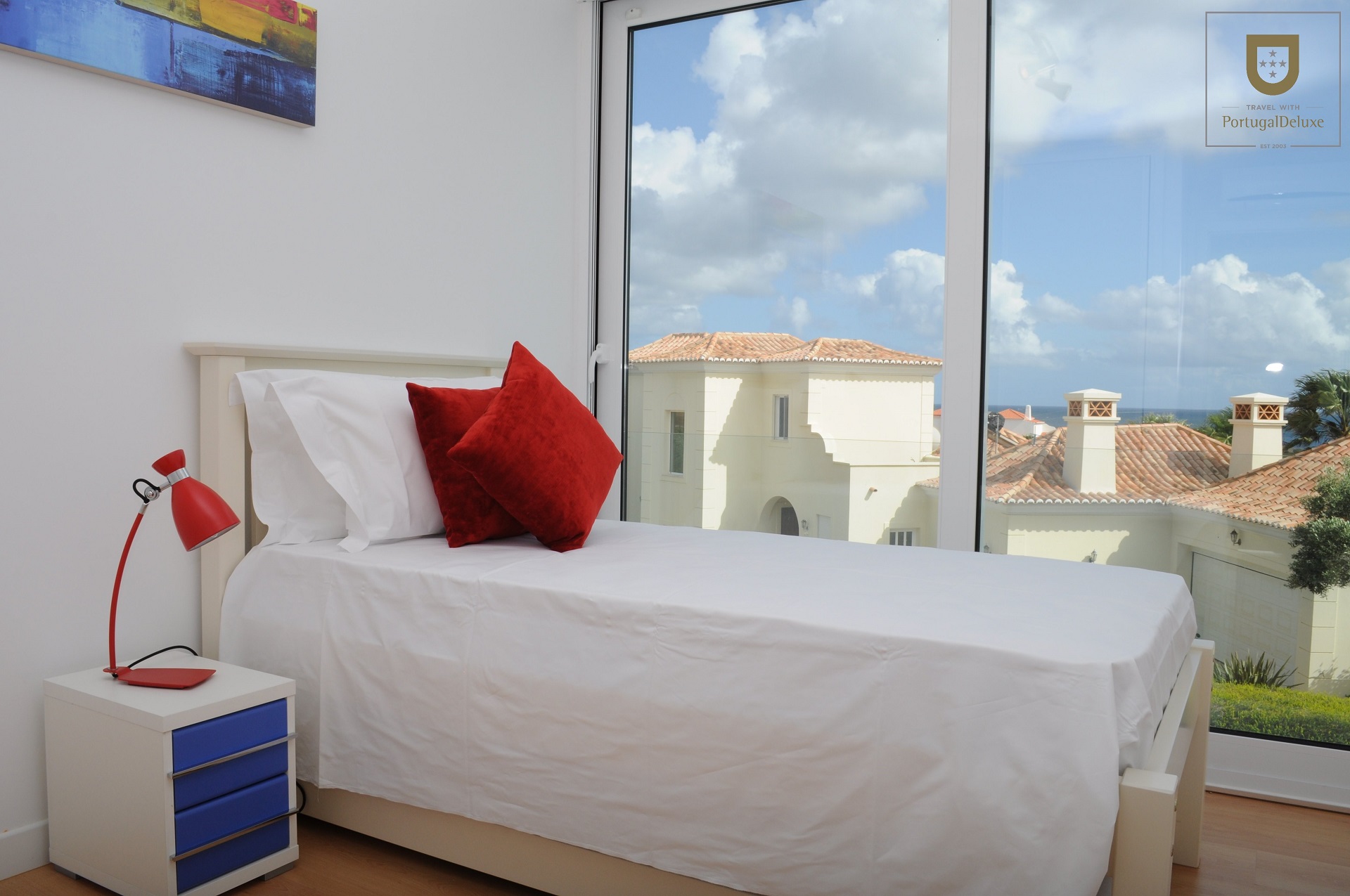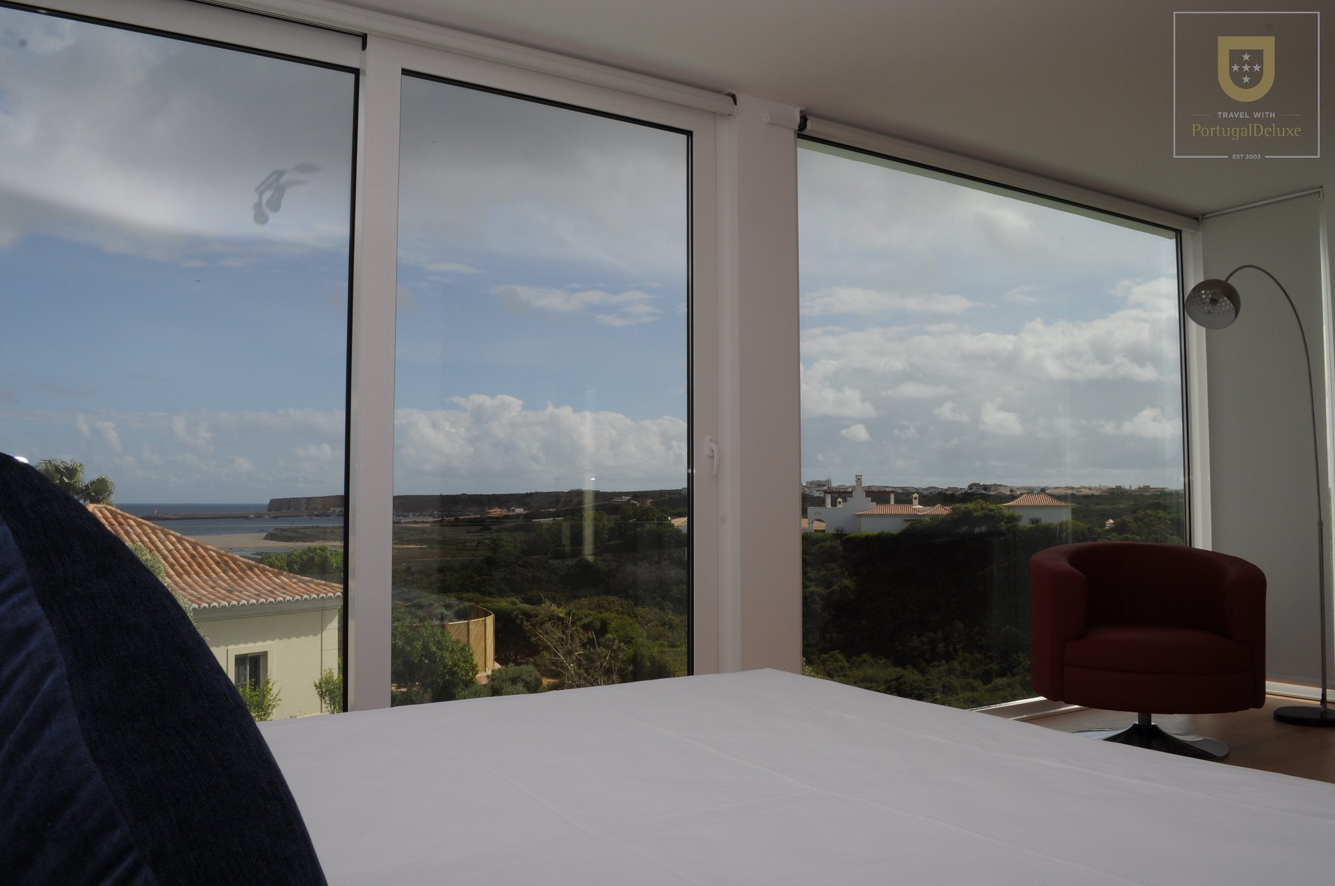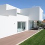Villa de design moderno com grandes portas e janelas em vidro que permitem a entrada de muita luz natural. O azul do céu e da água da piscina são realçados pela fachada branca da casa. A localização permite privacidade, mas também uma espetacular vista mar dos quartos do piso superior.