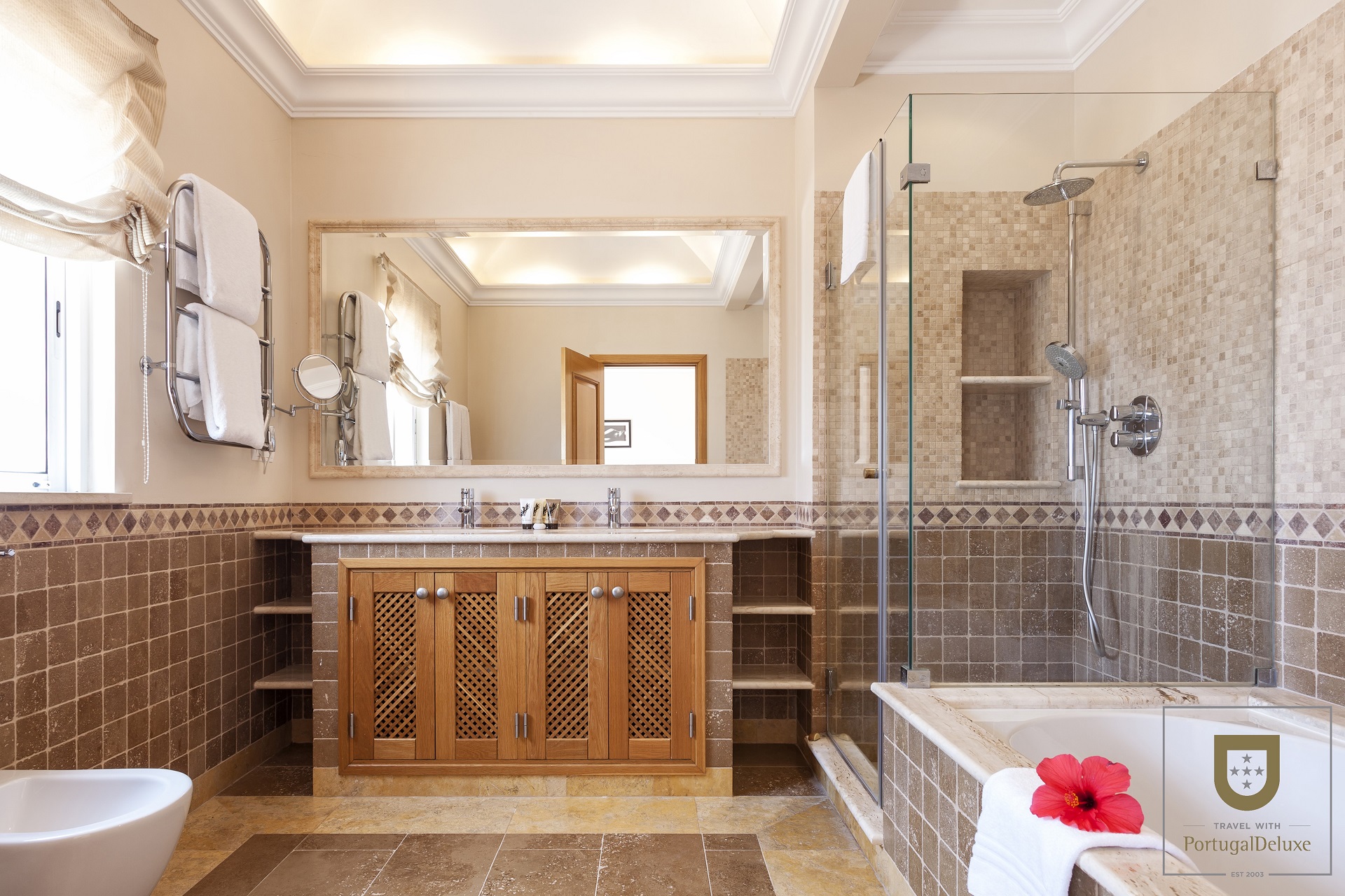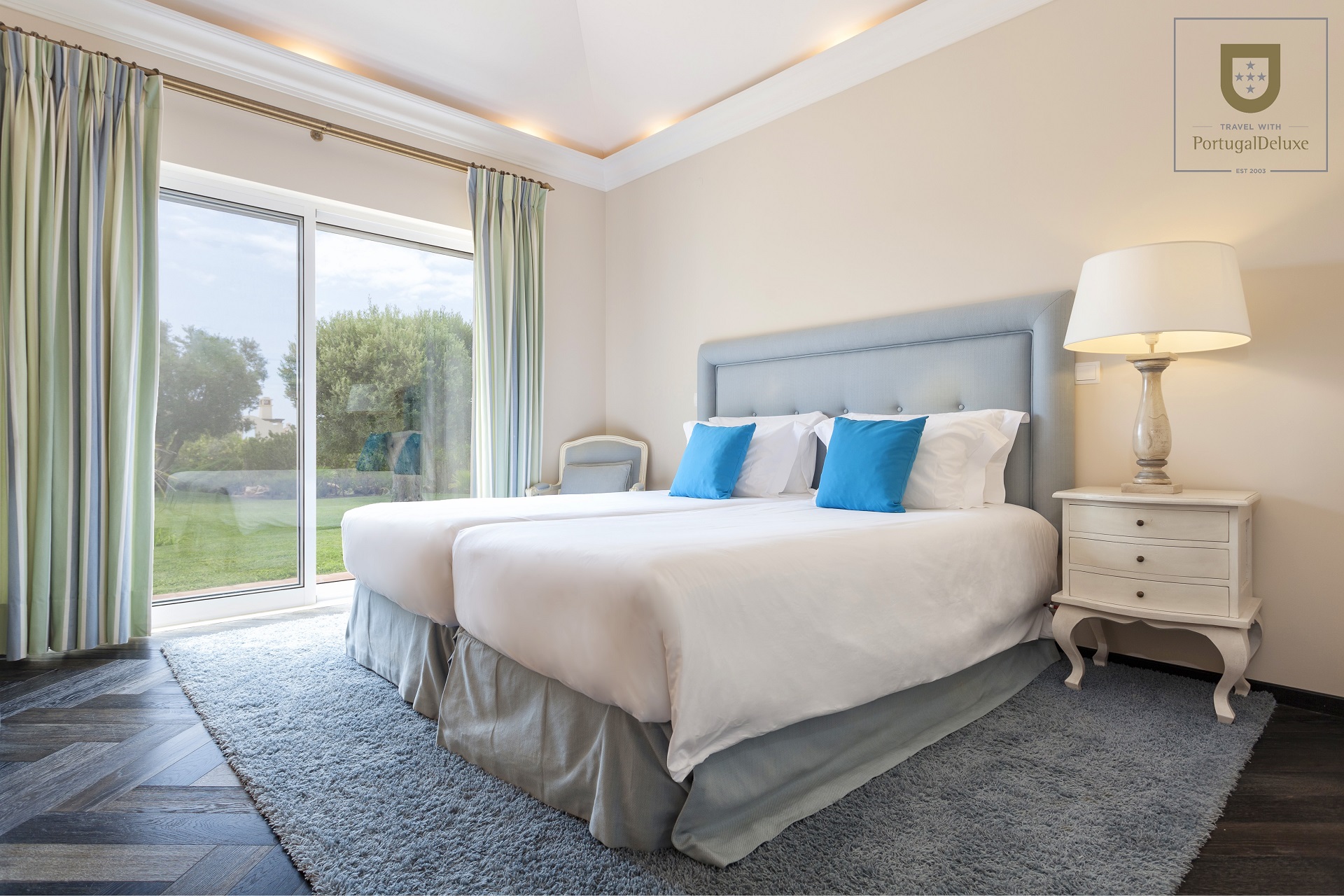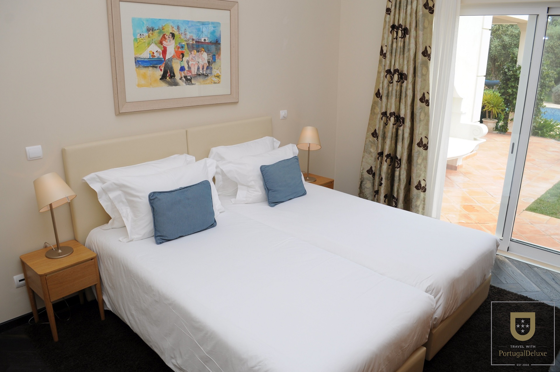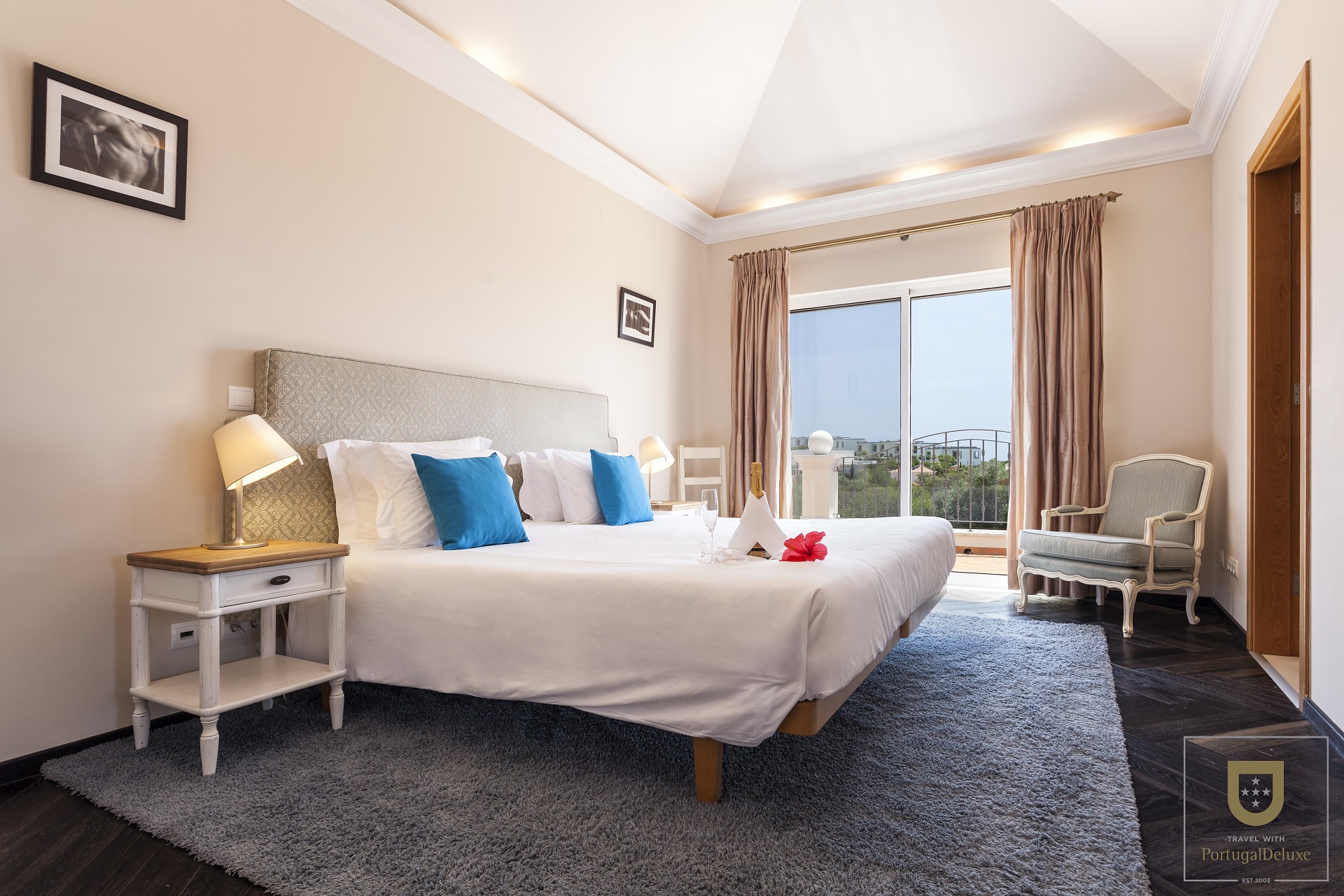 No piso inferior existe uma zona de alojamento com 2 quartos duplos, WC e 2 casas de banho. No piso de cima há mais 3 quartos e 2 casas de banho. Todos os quartos têm portas para o exterior e terraço ou varanda. A villa dispõe também de ar condicionado e pavimento aquecido.