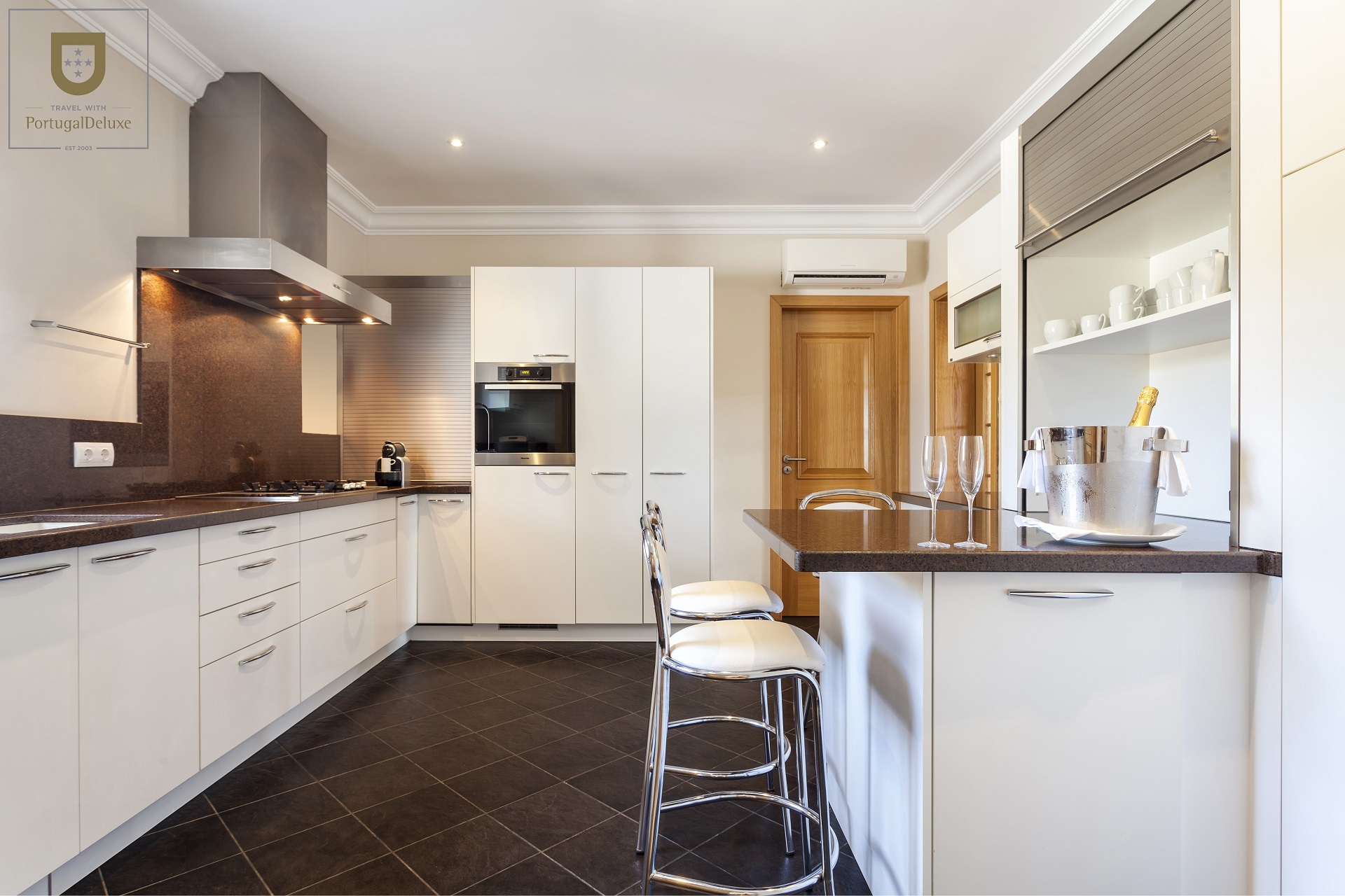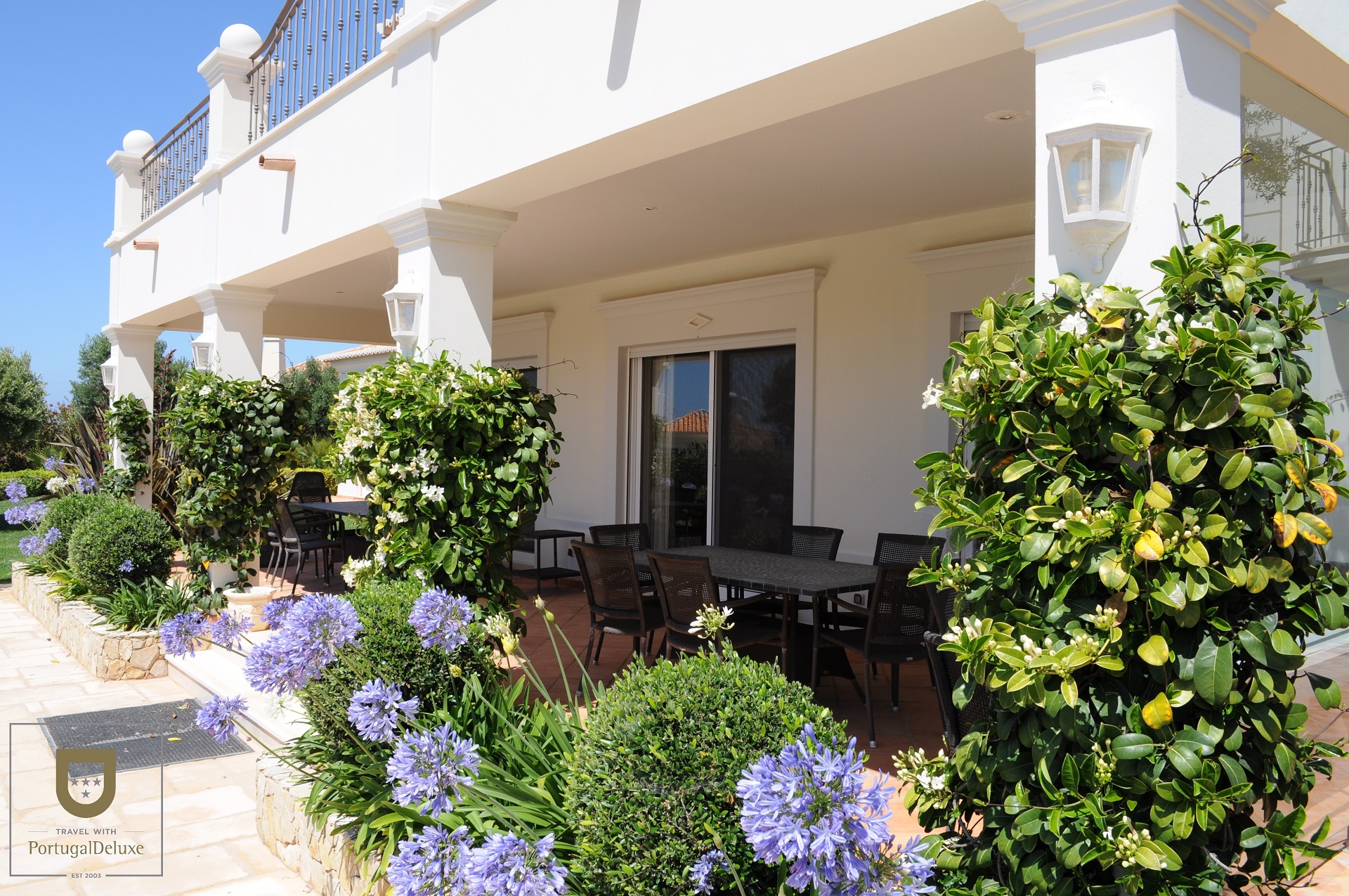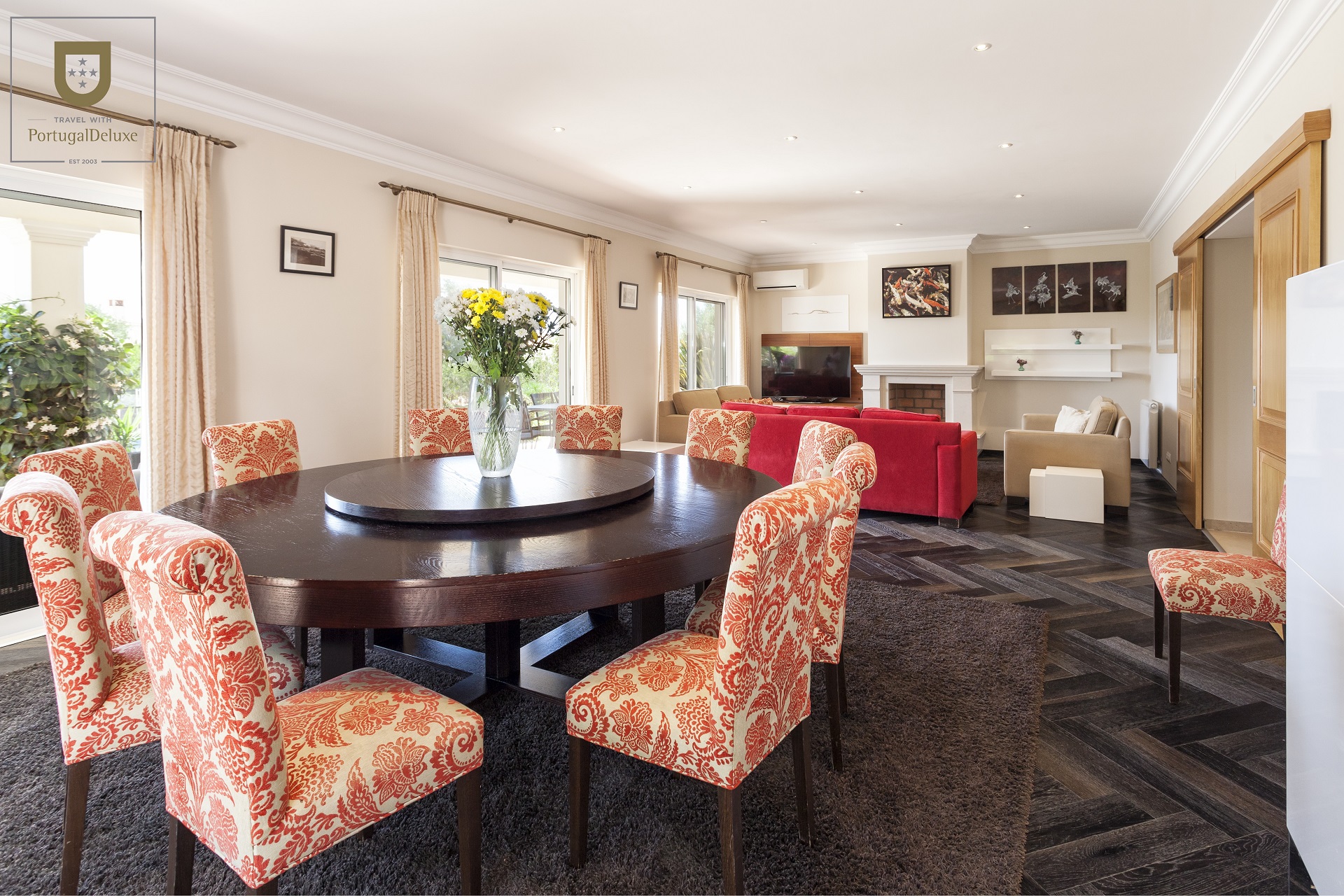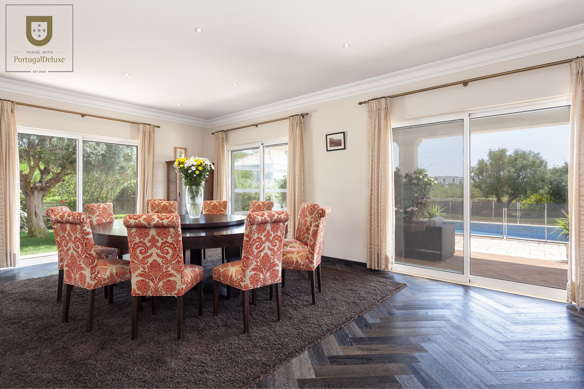 O hall de entrada guia-nos até à sala com sofás confortáveis, TV satélite, DVD e tudo o que precisa para relaxar. A área de jantar é aberta para o salão com grandes portas para o exterior proporcionando acesso fácil à piscina e terraço. A cozinha está totalmente equipada e existe também uma sala com máquina de lavar e secar roupa e garrafeira.