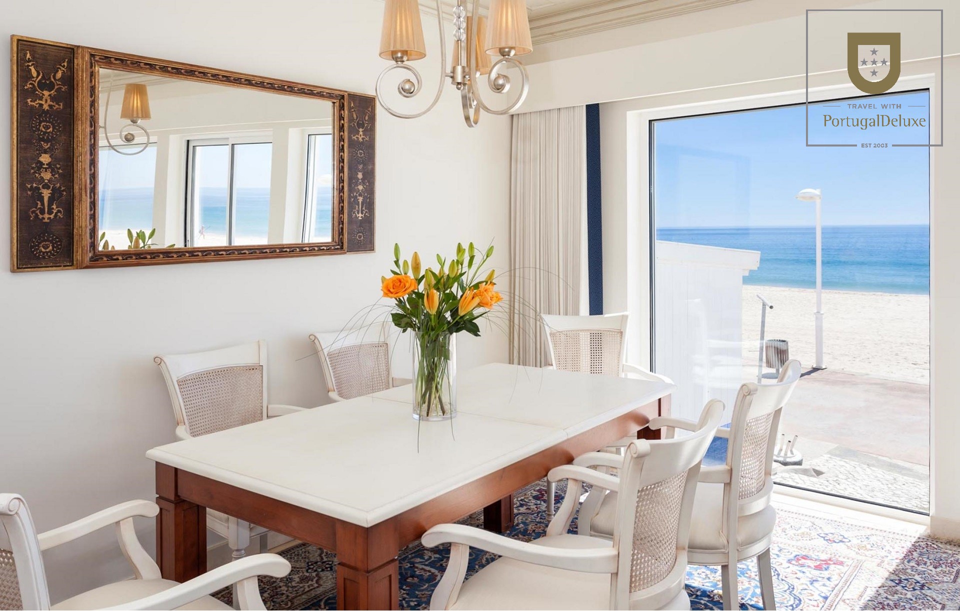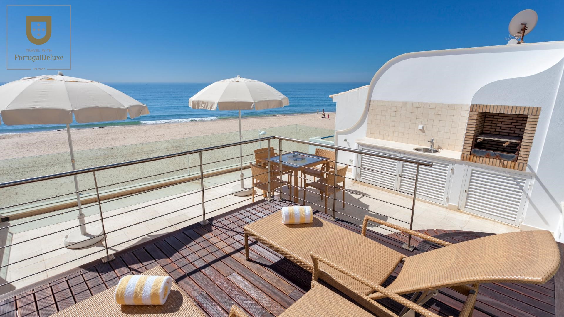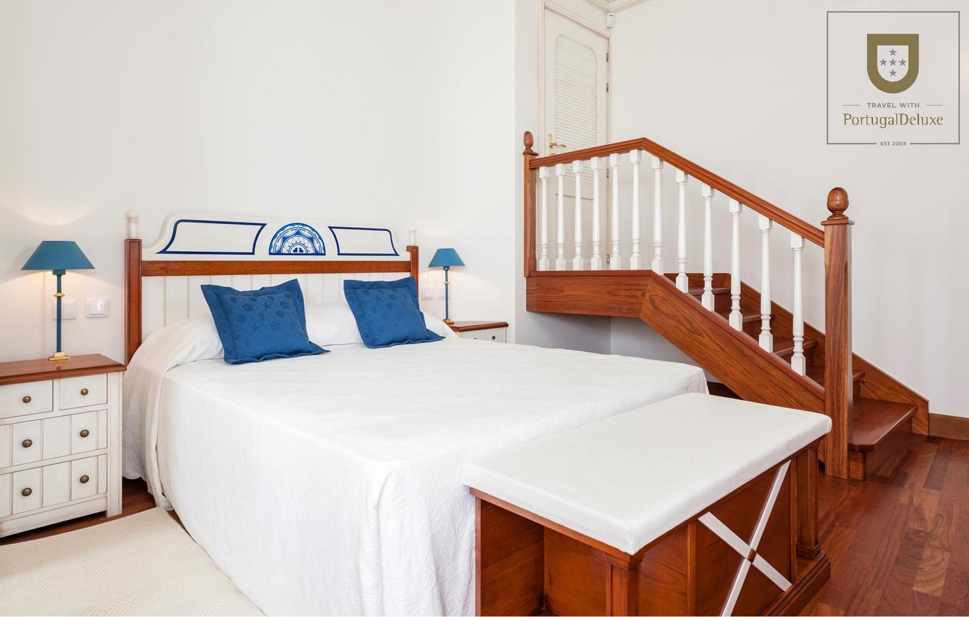 Primeiro Piso: 1uarto principal com cama de casal e vistas privilegiadas sobre a praia e o Oceano Atlântico, TV, quarto de banho ensuite com chuveiro, cortinas elétricas. Acesso ao terraço sobre a Casa nº 2 através de uma ponte de vidro. O terraço apresenta barbecue, mesa e cadeiras para quatro pessoas, espreguiçadeiras e chapéu-de-sol, oferecendo um cenário espetacular sobre a praia.