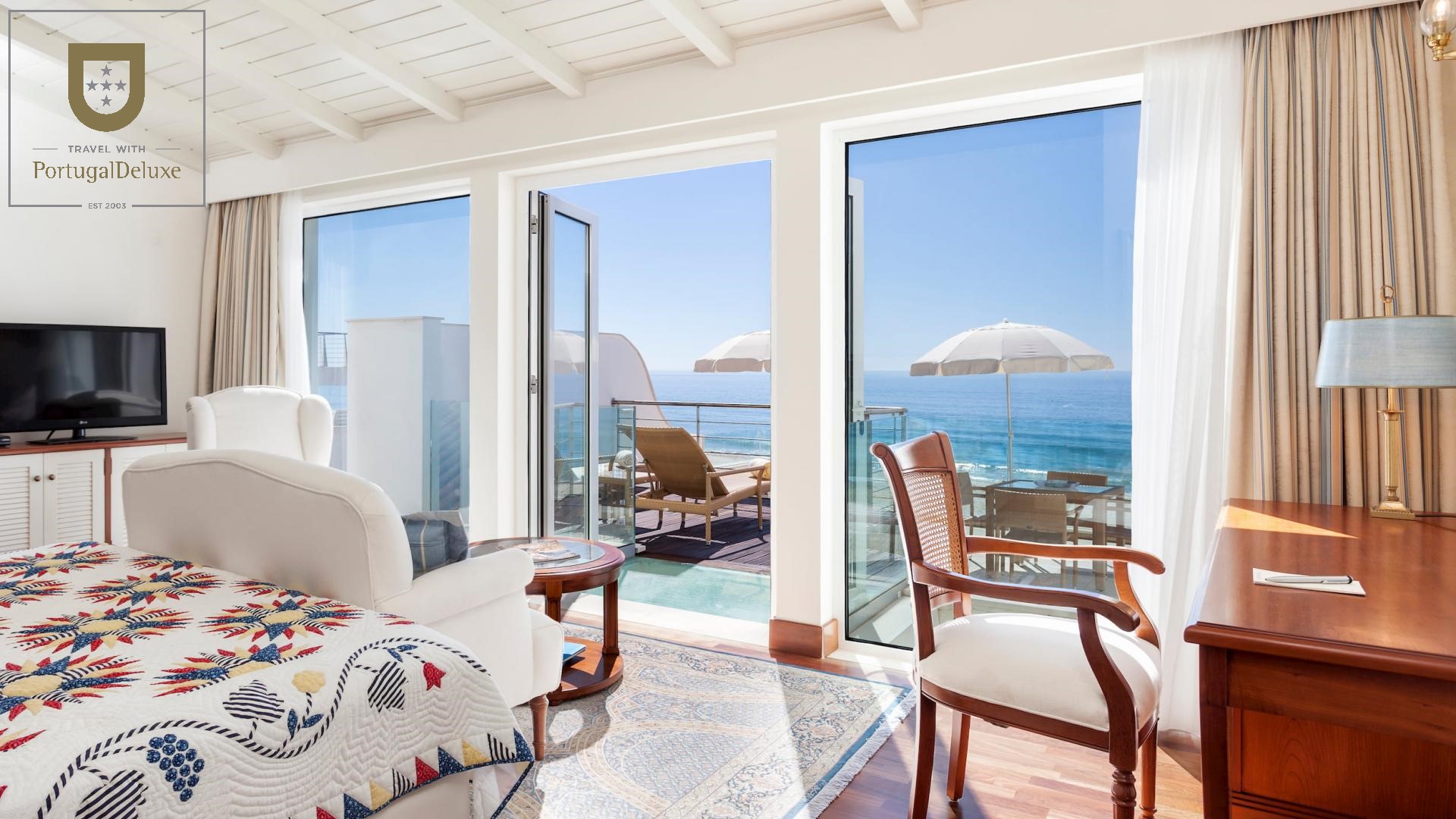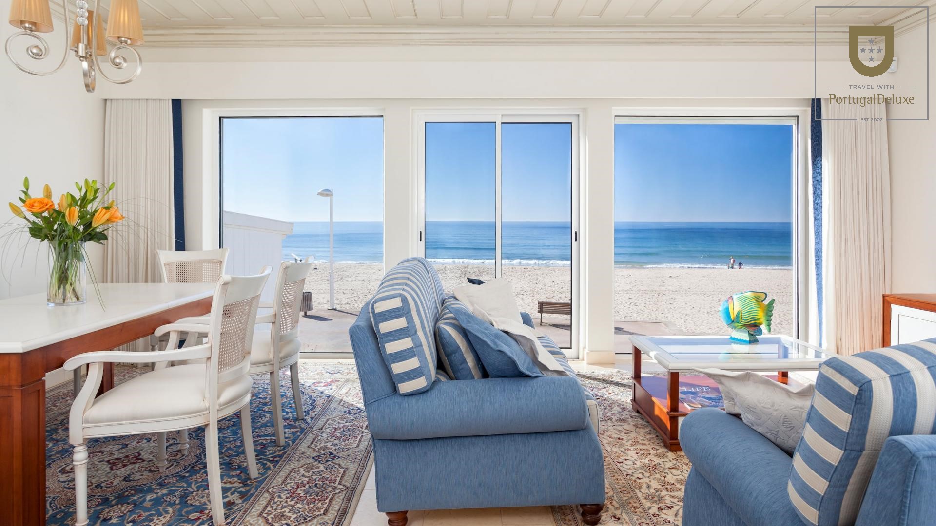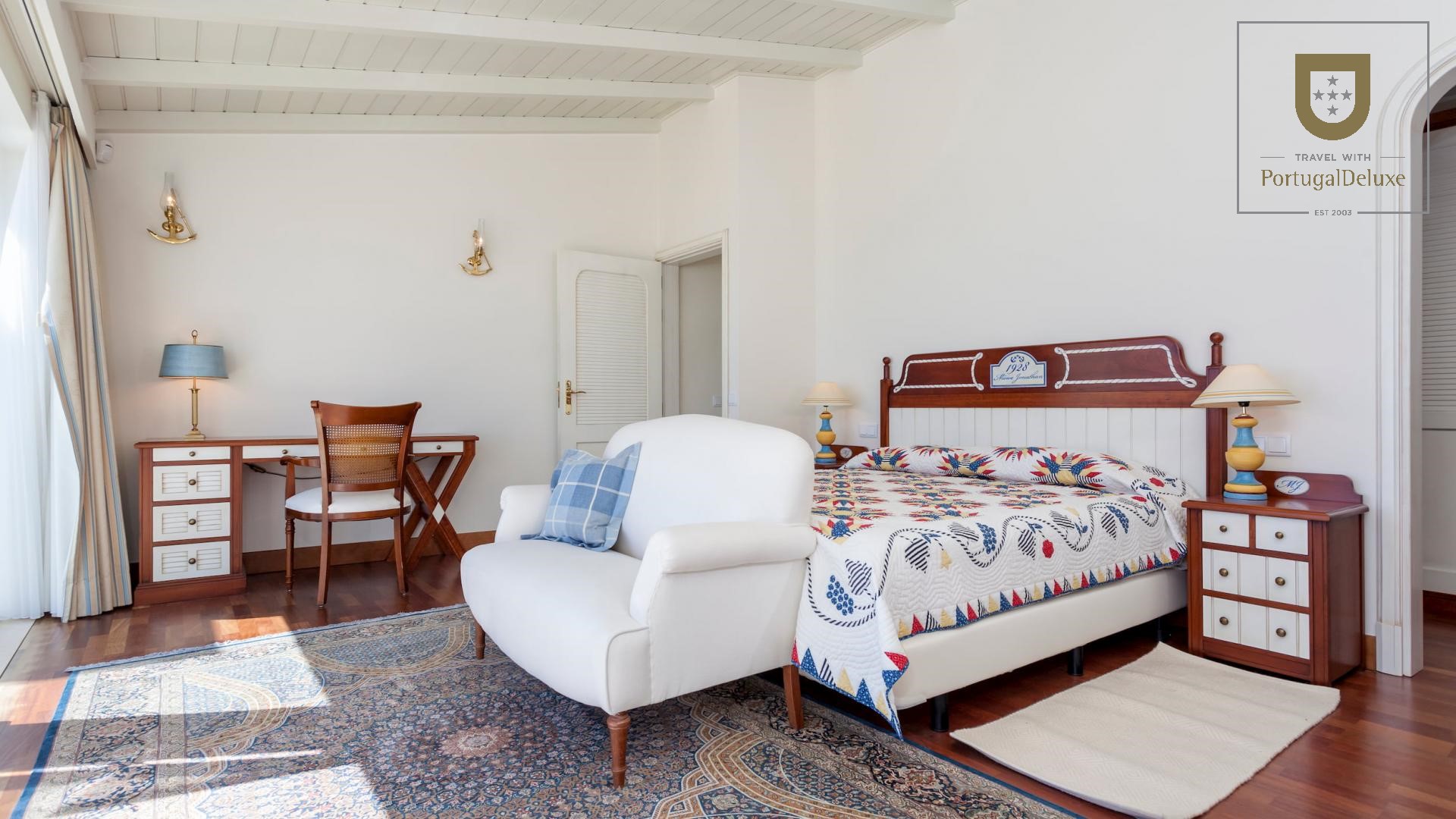 Primeiro Piso: 1uarto principal com cama de casal e vistas privilegiadas sobre a praia e o Oceano Atlântico, TV, quarto de banho ensuite com chuveiro, cortinas elétricas. Acesso ao terraço sobre a Casa nº 2 através de uma ponte de vidro. O terraço apresenta barbecue, mesa e cadeiras para quatro pessoas, espreguiçadeiras e chapéu-de-sol, oferecendo um cenário espetacular sobre a praia.